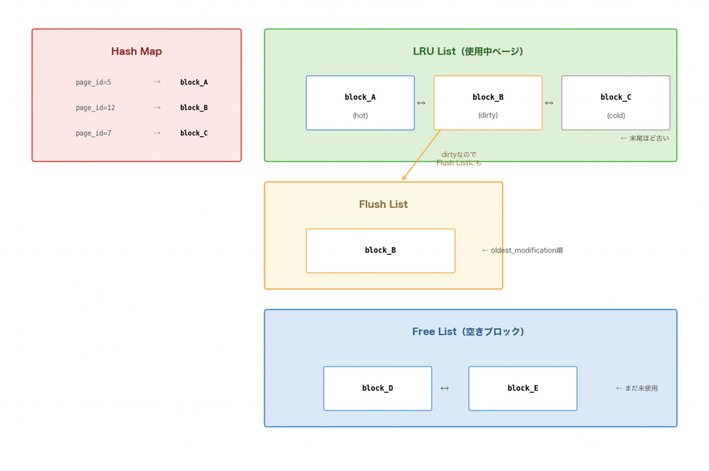 - メモリ上のデータ構造(Hash Map、LRU List、Free List、Flush List)