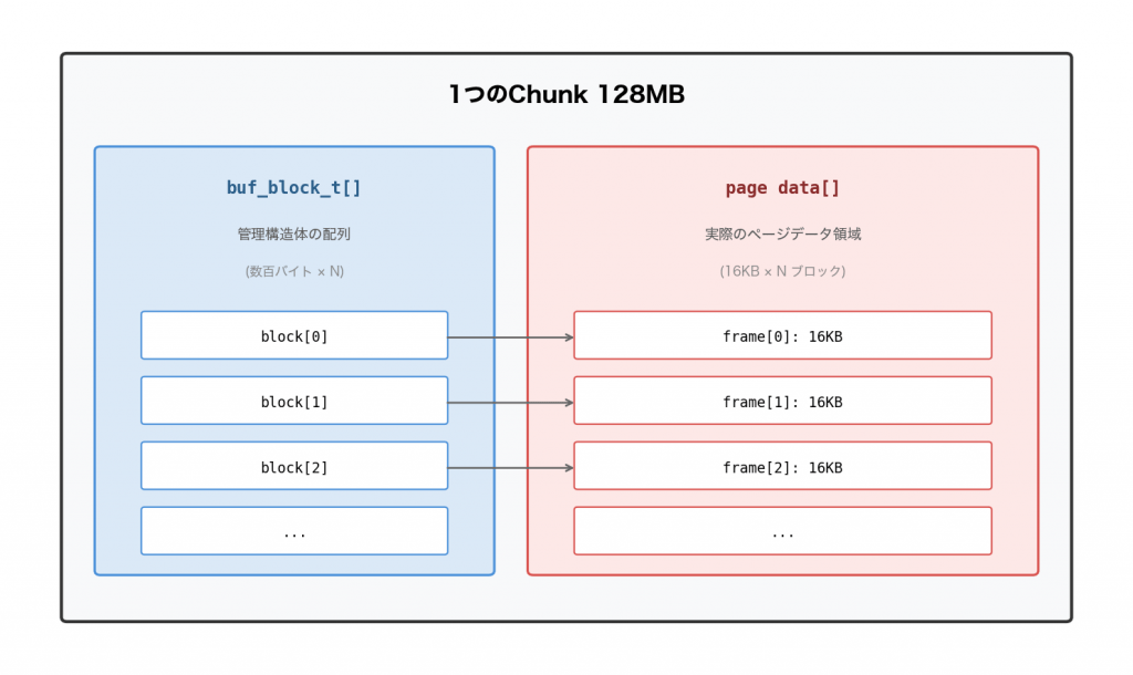 InnoDBはこれを効率的に管理するため、Chunkという単位でメモリを確保します(デフォルト128MB)。1つのChunkの中身はこうなっています: