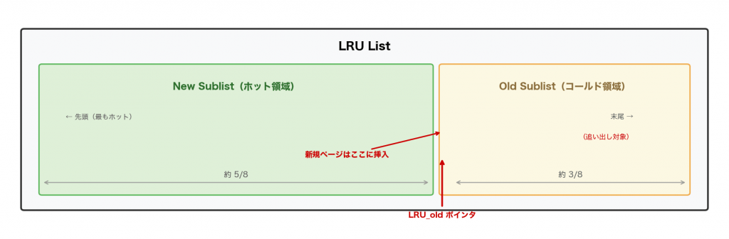 | LRU | New/Old Sublist分割でスキャン耐性を確保 |